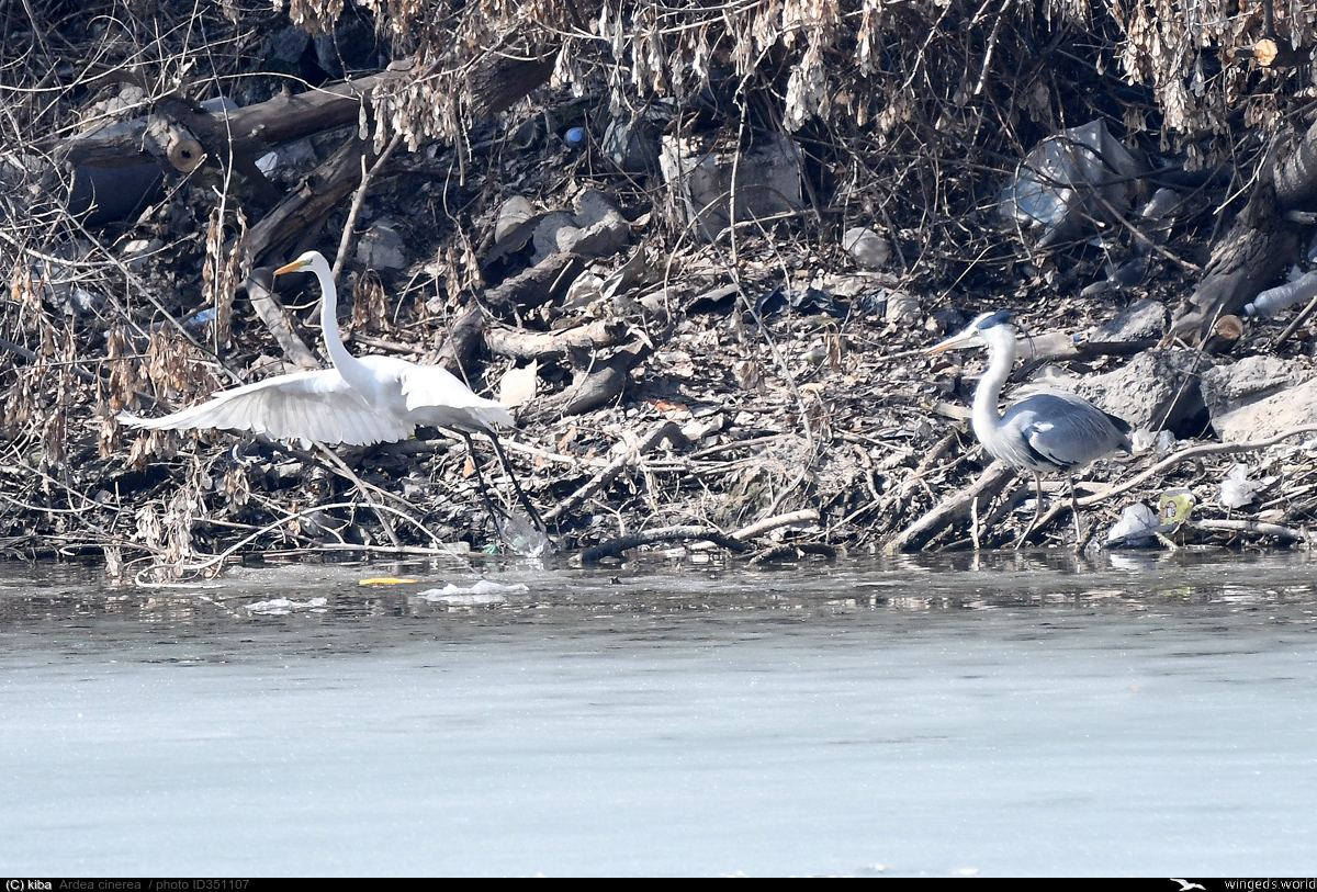 Серый цапель прогоняет белого